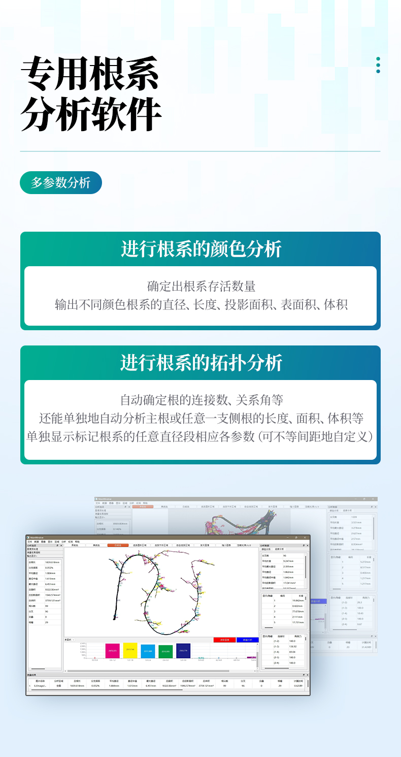 (15)能進行根系的拓撲分析,自動確定根的連接數(shù)、關(guān)系角等,還能單獨地自動分析任意一段根的長度、面積、體積等,可單獨顯示標記根系的任意直徑段相應各參數(shù)(可不等間距地自定義)。