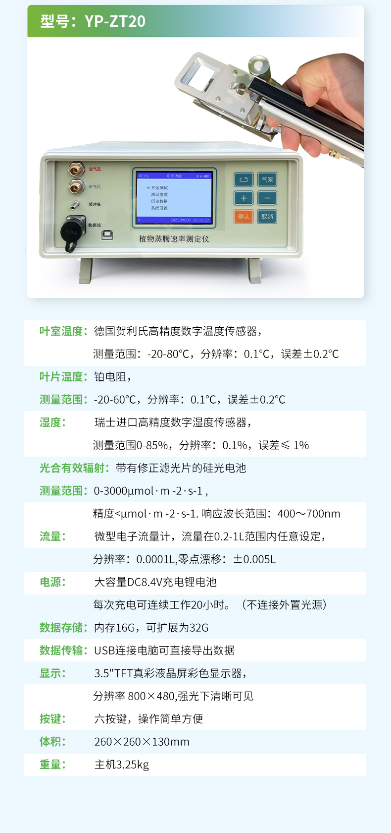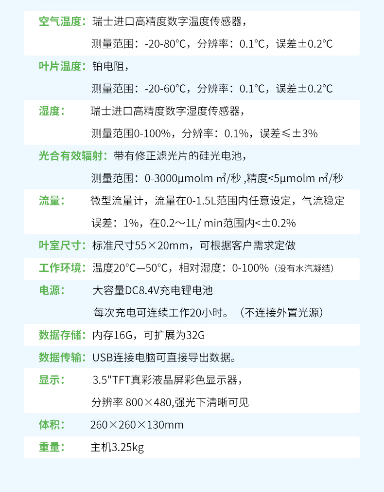 【產(chǎn)品簡介】蒸騰速率、氣孔導(dǎo)度、氣孔阻抗、葉片溫度、葉室溫度、葉室濕度、空氣溫度、空氣濕度、光合有效輻射