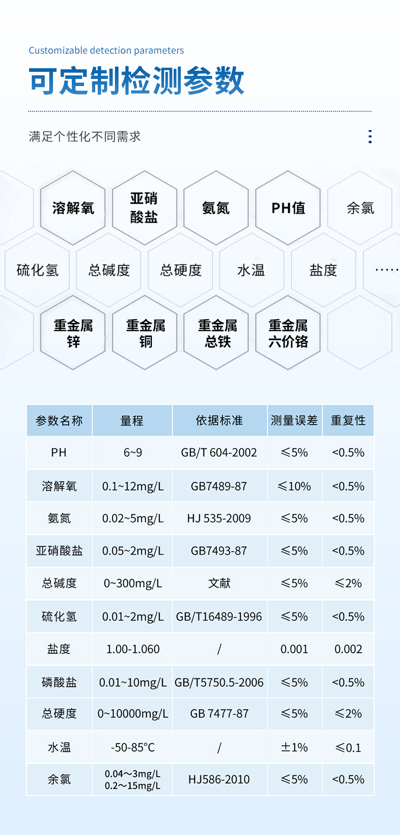 余氯、總氯、有效氯、氨氮、溶解氧、pH、濁度、懸浮物、二氧化氯、臭氧、尿素、色度、氯化物、氰尿酸、硫化氫、亞硝酸鹽、磷酸鹽、總硬度、總堿度、水溫、鹽度等20多種檢測指標任選9種;