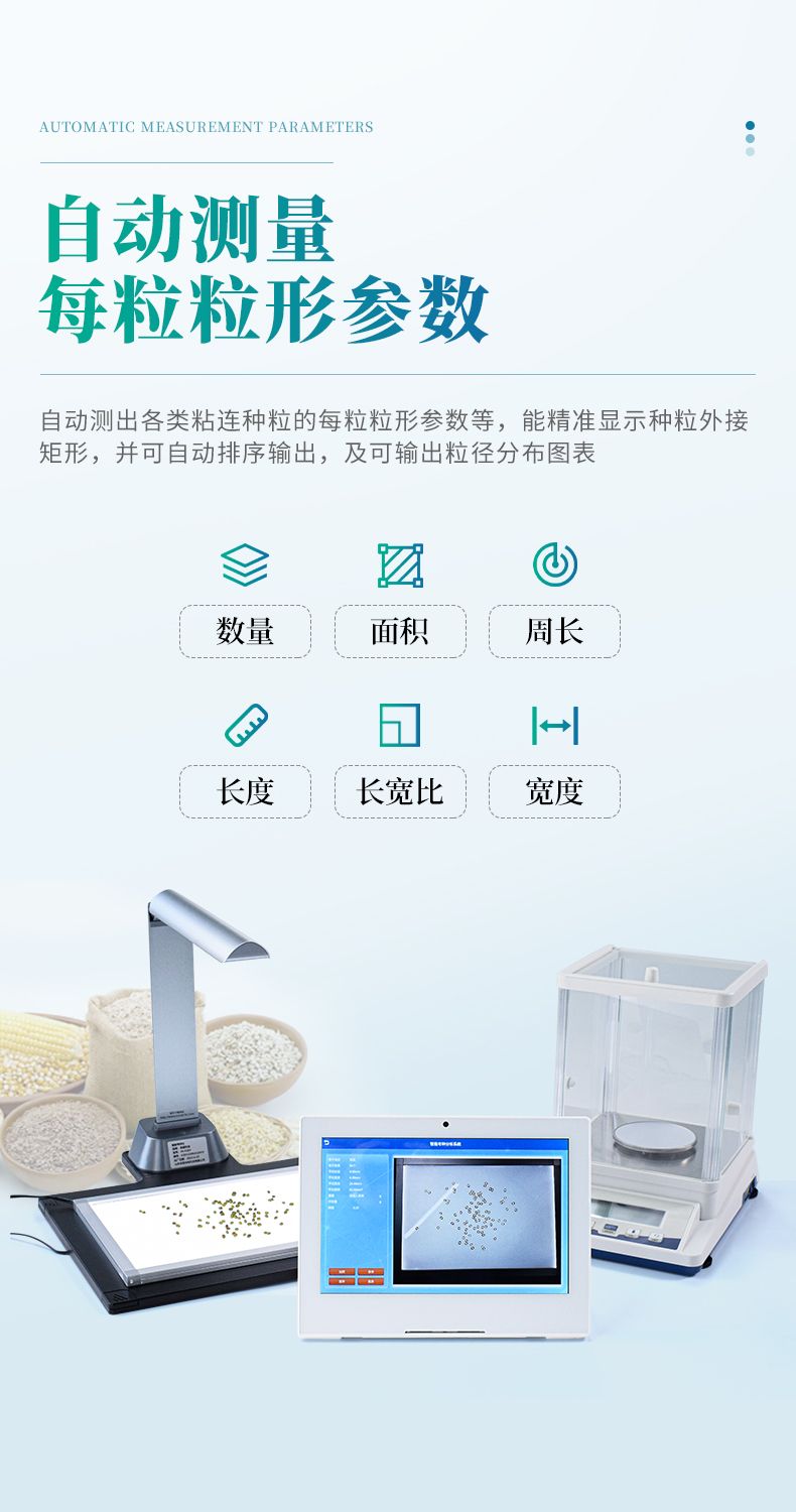 4、能自動測出各類粘連種粒的每粒粒形參數(shù)(長、寬、長寬比、面積、周長)。各類種粒的各尺寸測量誤差≤±0.1mm。