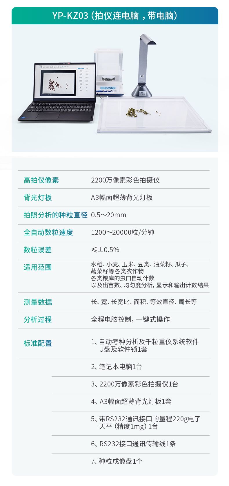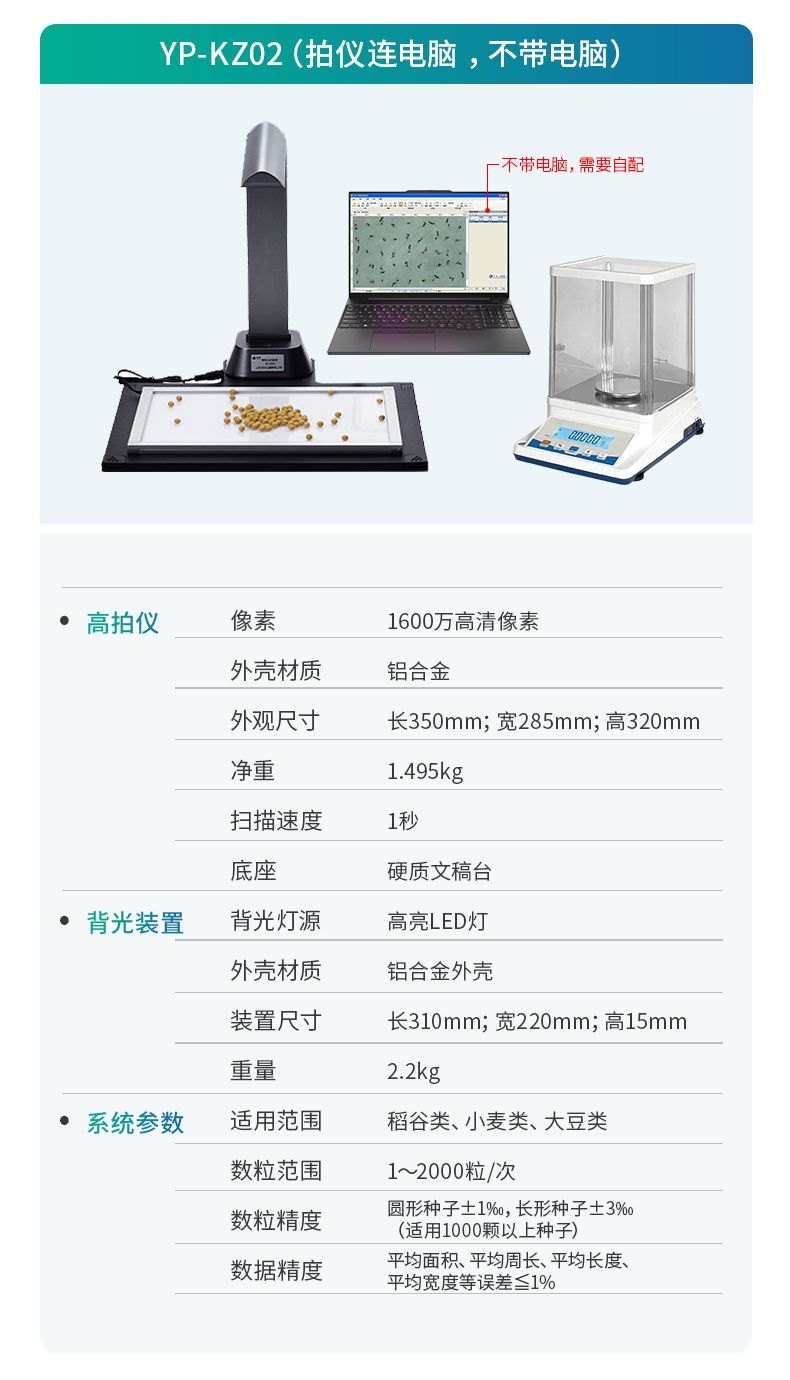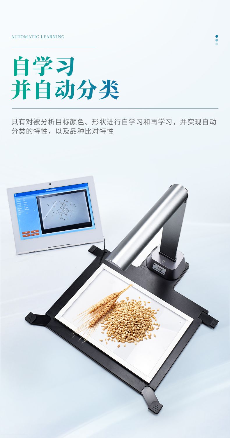 智能考種系統(tǒng)由1600萬高拍儀和背光裝置組成。背光裝置采用的是高亮LED燈,外邊框使用鋁合金材質(zhì)制成。軟件采用先進的圖像處理技術,根據(jù)距離變換原理、形態(tài)學、凸包檢測等技術綜合設計的一款嵌入式軟件。該設備主要應用在農(nóng)業(yè)領域的田間作物測產(chǎn)及考種等方面,通過高拍儀拍攝的照片,軟件自動計算種子數(shù)量,種子的面積、周長、長度、寬度、長寬比等數(shù)據(jù),根據(jù)天平所得的重量與種子的數(shù)量自動計算出千粒重;以列表和圖形的方式輸出結果,便于用戶查看與分析研究。本產(chǎn)品也可以手動對作物種子數(shù)量修正以確保計數(shù)精度、對數(shù)據(jù)進行保存,并且可以查看數(shù)據(jù)報表,最后可以將數(shù)據(jù)以Excel格式導出。