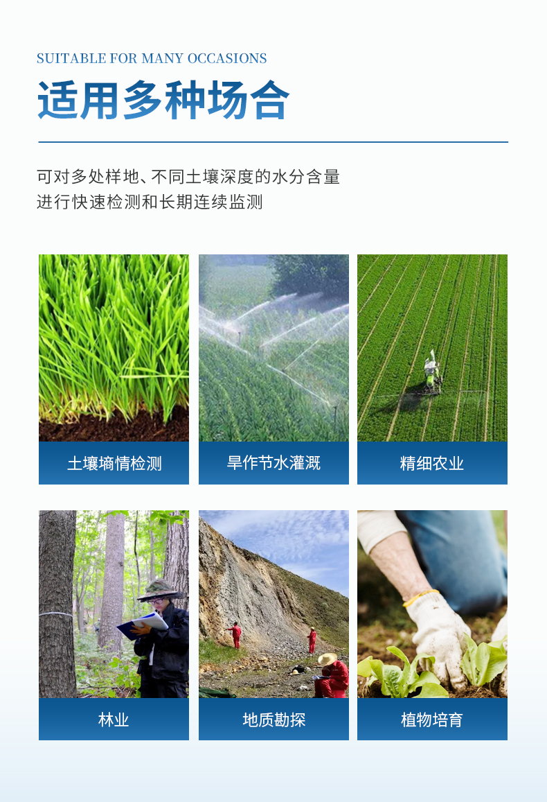 廣泛應(yīng)用于土壤墑情檢測、旱作節(jié)水灌溉、精細農(nóng)業(yè)、林業(yè)、地質(zhì)勘探、植物培育、水利、環(huán)保等領(lǐng)域。