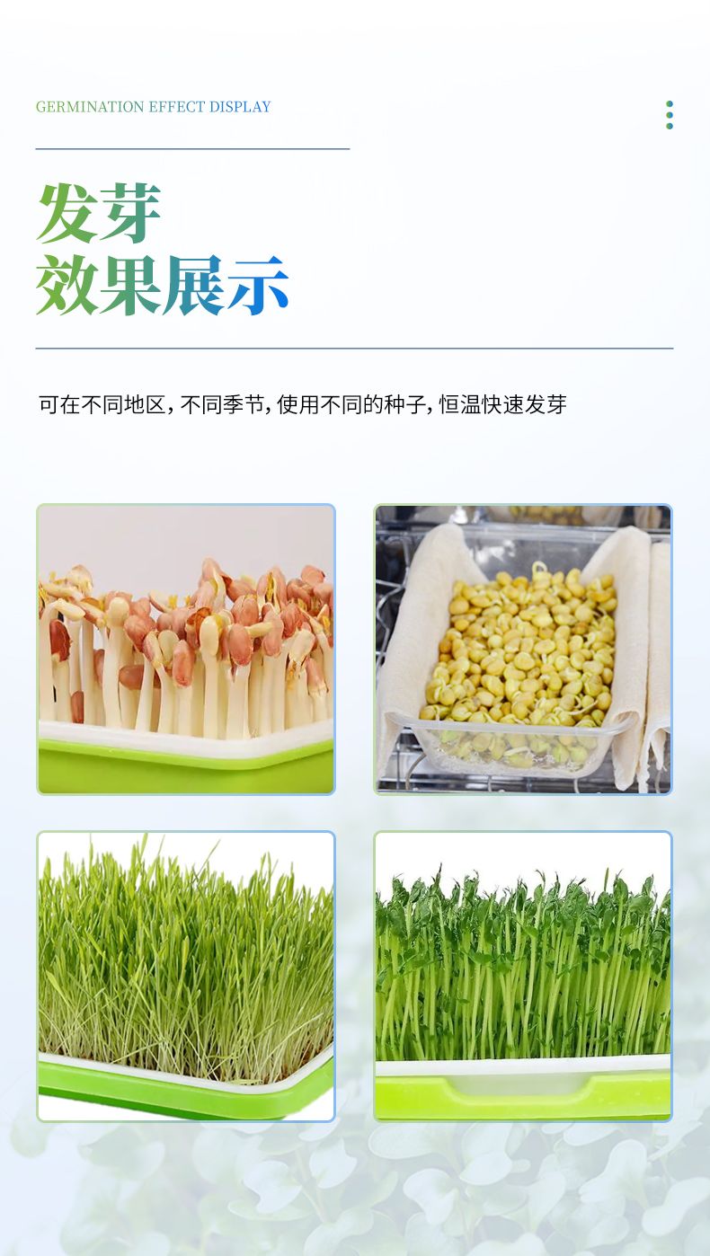 2、此箱可在不同地區(qū)不同季節(jié)使用不同的種子恒溫快速發(fā)芽,由于恒溫的作用,使種子的蛋白酶等化學(xué)物質(zhì)迅速分解反應(yīng),避免了溫差出芽造成的能量丟失,使種子出芽后抗病力強(qiáng),提高幼苗免疫能力,縮短了種子的出芽的時(shí)間。經(jīng)該器械出的幼芽,芽苗質(zhì)量好,成活率高。