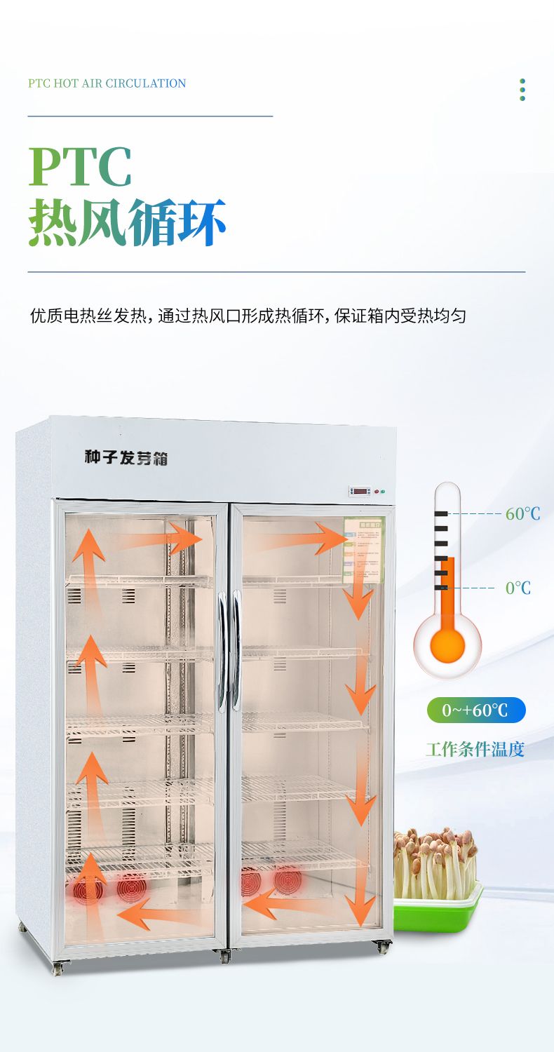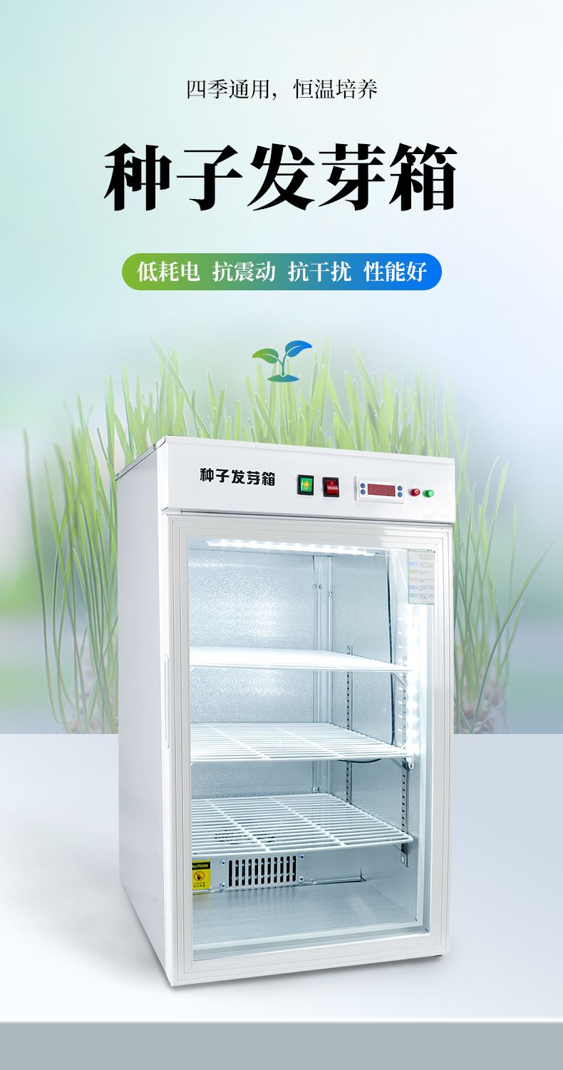 2、此箱可在不同地區(qū)不同季節(jié)使用不同的種子恒溫快速發(fā)芽,由于恒溫的作用,使種子的蛋白酶等化學(xué)物質(zhì)迅速分解反應(yīng),避免了溫差出芽造成的能量丟失,使種子出芽后抗病力強(qiáng),提高幼苗免疫能力,縮短了種子的出芽的時間。經(jīng)該器械出的幼芽,芽苗質(zhì)量好,成活率高。