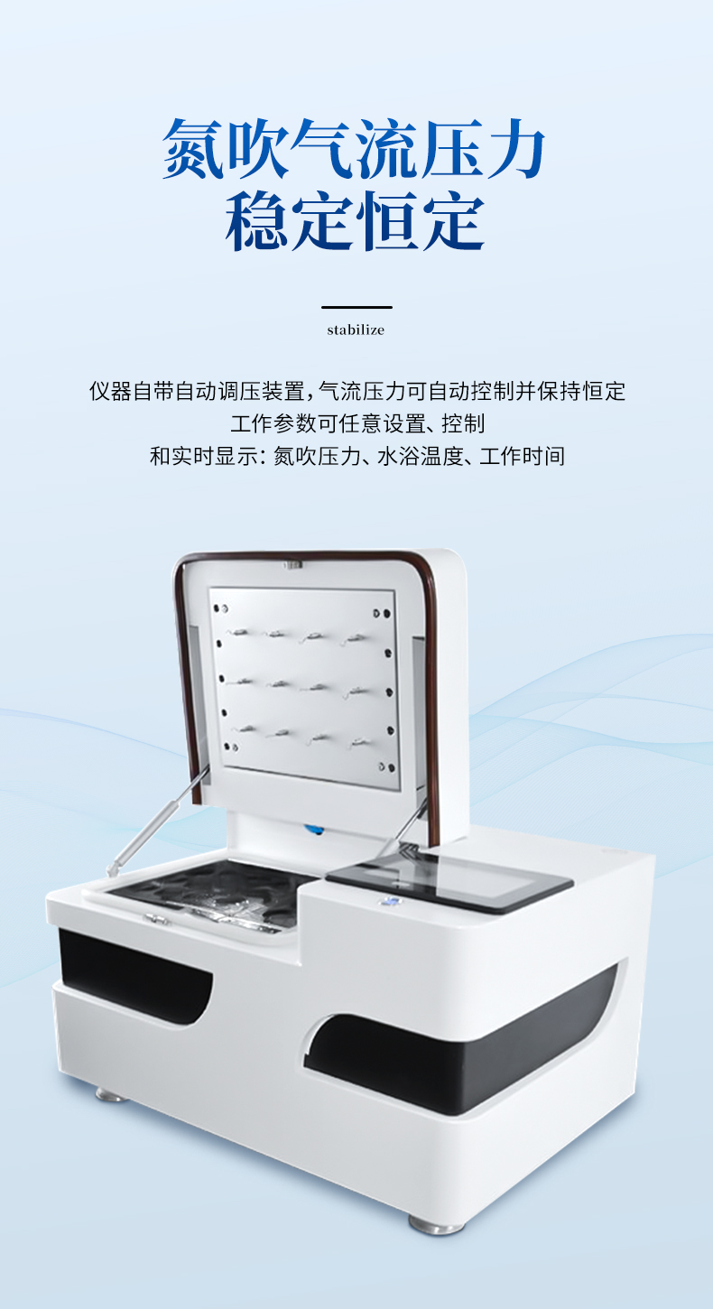 全自動多功能干式氮吹儀YP-QD24G是我司結(jié)合實驗室使用需求,從使用者方便安全快捷穩(wěn)定等多角度共同開發(fā)的新型濃縮定容產(chǎn)品,產(chǎn)品擺脫了常規(guī)市場上利用水浴加熱揮發(fā)而導致樣品進行污染的弊端,確定樣品的安全性與準確性,具有無人值守、準確定容、大批量濃縮的特點,可多組數(shù)據(jù)儲存功能,實現(xiàn)了全自動化的定量及批量濃縮,濃縮全程,讓繁瑣的濃縮過程變得靈活、省心、高效和安全。