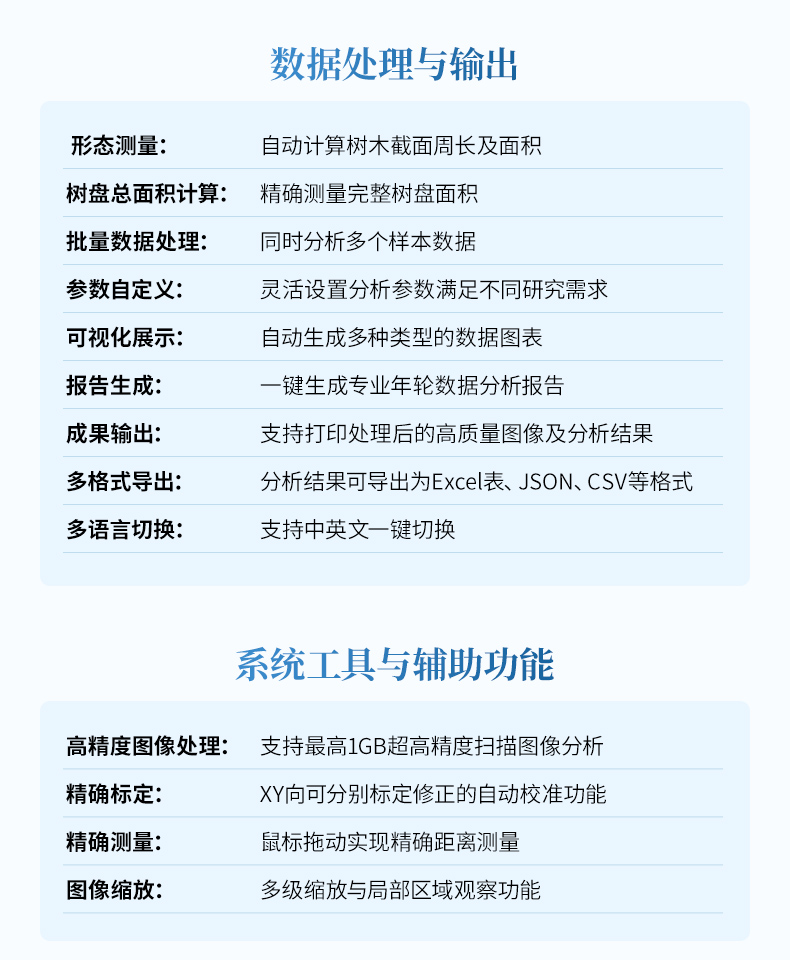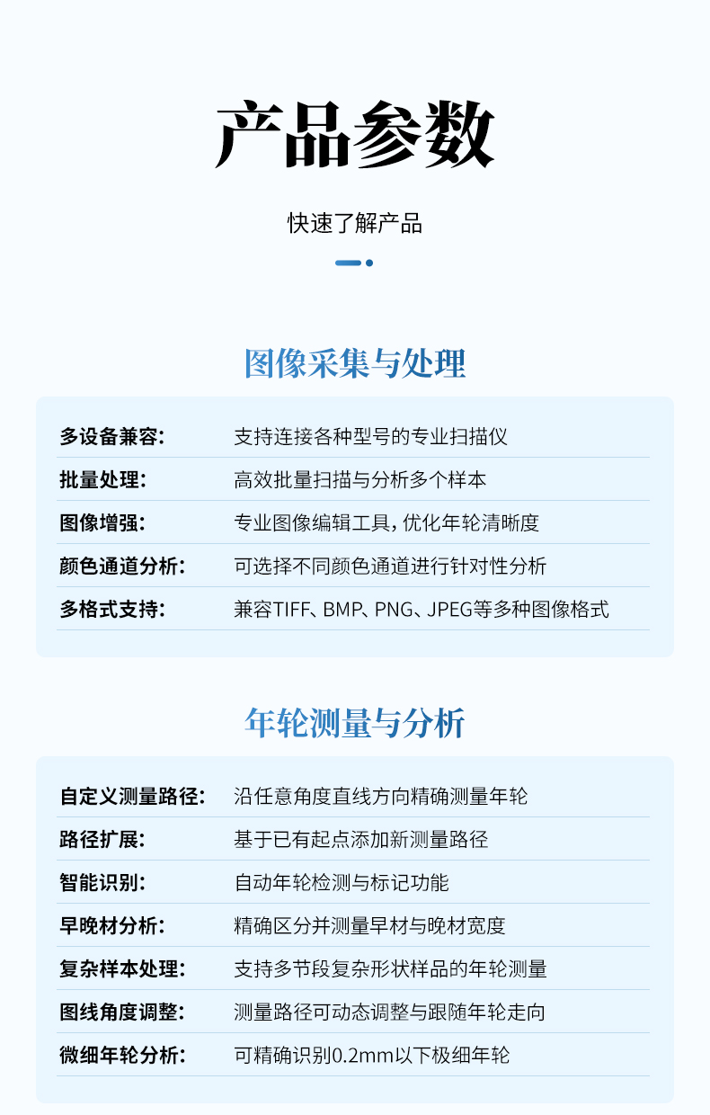 年輪圖像分析系統(tǒng)是一款專業(yè)的樹木年輪研究工具,用于對盤狀木材截面或柱狀生長錐樣本進行年輪分析。系統(tǒng)集成了圖像采集、分析處理和數(shù)據(jù)統(tǒng)計等功能,可為林業(yè)研究、生態(tài)學研究等領域提供準確的數(shù)據(jù)支持。