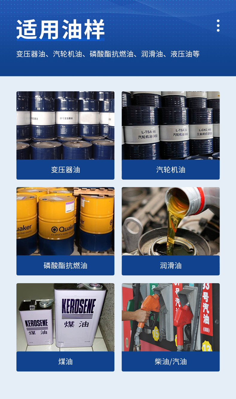8、適用油樣:變壓器油、汽輪機油、磷酸酯抗燃油、潤滑油等