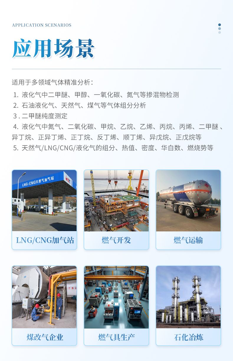 1.石油液化氣中二甲醚、甲醇、一氧化碳、氮氣等添加氣體含量2.石油液化氣、天然氣、煤氣等氣體組分