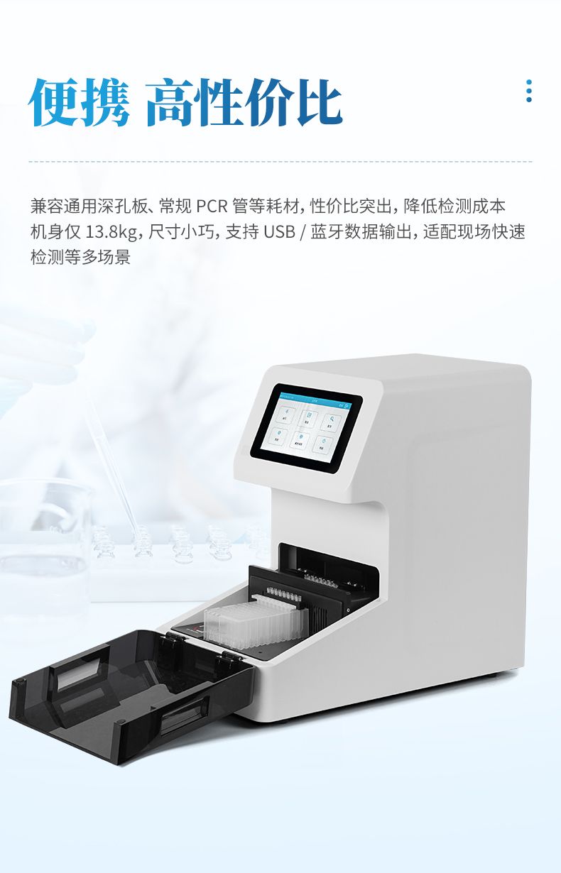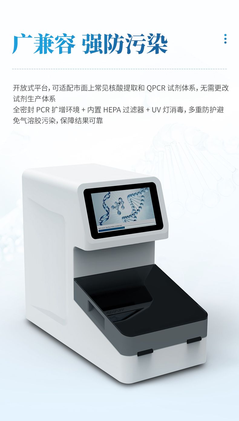 實(shí)現(xiàn)“樣本進(jìn)-結(jié)果出”的全自動流程。PCR擴(kuò)增在密閉的環(huán)境中進(jìn)行核酸的擴(kuò)增和檢測,可避免氣溶膠污染。儀器為開放系統(tǒng),可適配市面上常見的試劑體系,應(yīng)用場景廣泛,如動植物疫病檢測,現(xiàn)場快速檢測等。