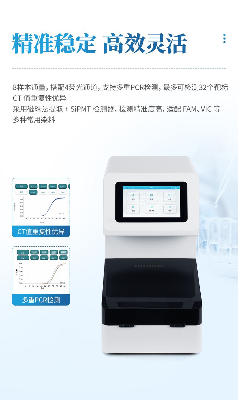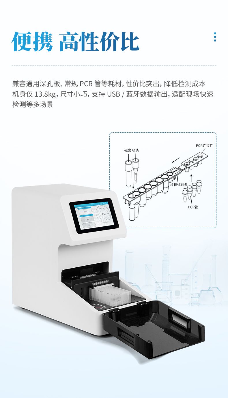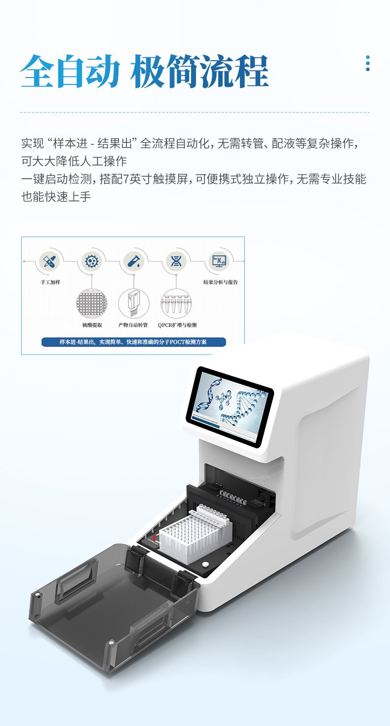 集核酸提取,熒光定量擴增,檢測為一體的全自動分子檢測一體機。