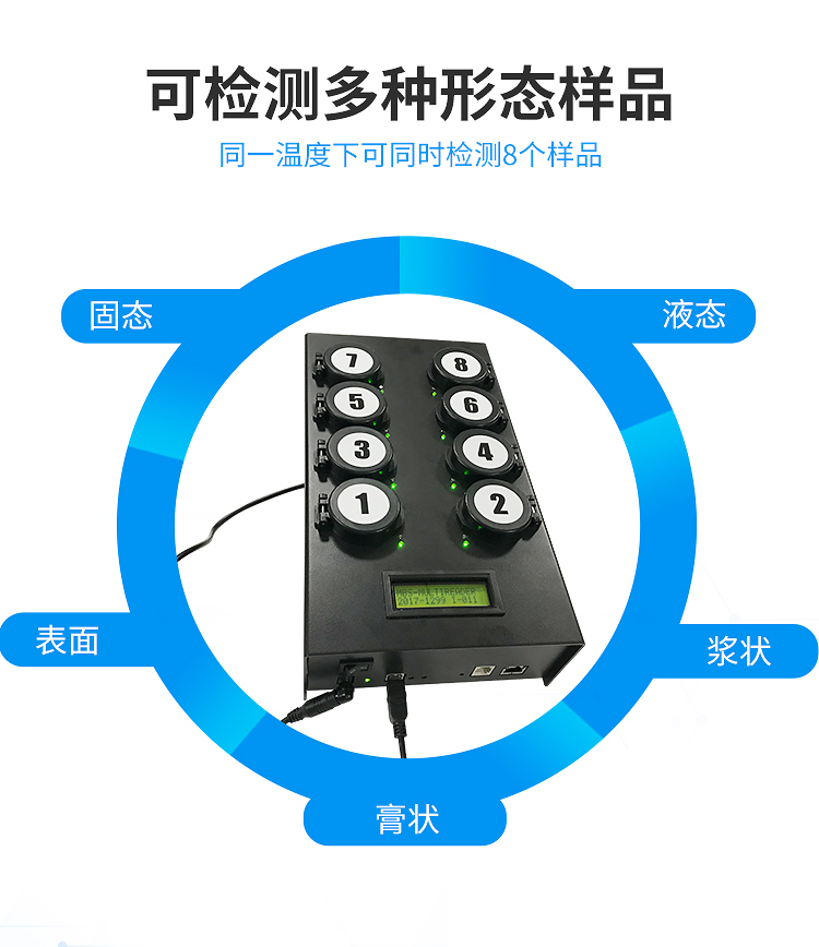 4) 檢測樣本只需1ml/1g;同一溫度下可同時(shí)檢測8個樣品;