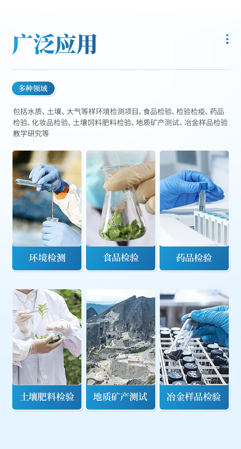 原子熒光光譜儀的應(yīng)用領(lǐng)域較為廣泛,主要測(cè)試樣品中 11 種超痕量元素的含量,最低檢測(cè)下限可達(dá)千億分之一級(jí)。應(yīng)用領(lǐng)域包括水質(zhì)、土壤、大氣等樣環(huán)境檢測(cè)項(xiàng)目、食品檢驗(yàn)、檢驗(yàn)檢疫、藥品檢驗(yàn)、化妝品檢驗(yàn)、土壤飼料肥料檢驗(yàn)、地質(zhì)礦產(chǎn)測(cè)試、冶金樣品檢驗(yàn)、教學(xué)研究等。