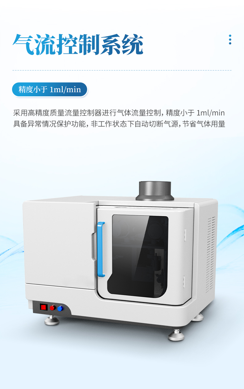 儀器采用高精度質(zhì)量流量控制器進(jìn)行氣體流量控制,精度小于 1ml/min。同時(shí)具備異常情況保護(hù)功能,儀器非工作狀態(tài)下自動(dòng)切斷氣源,節(jié)省氣體用量。