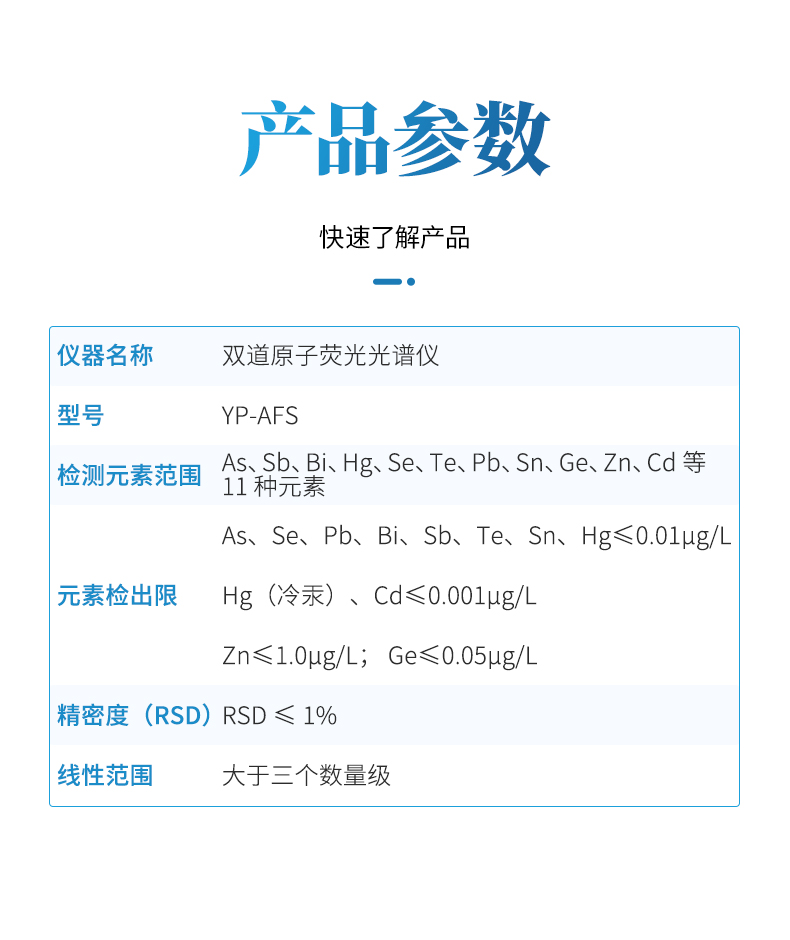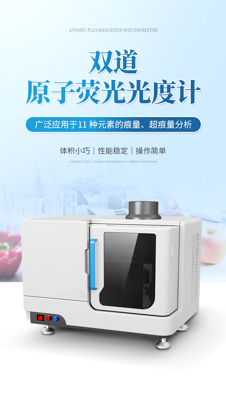 雙道原子熒光光譜儀廣泛應(yīng)用于汞(Hg)、砷(As)、銻(Sb)、鉍(Bi)、硒(Se)、碲(Te)、鎘(Cd)、鍺(Ge)、鉛(Pb)、錫(Sn)、鋅(Zn)等11 種元素的痕量、超痕量分析,體積小巧,性能穩(wěn)定,操作簡(jiǎn)單。