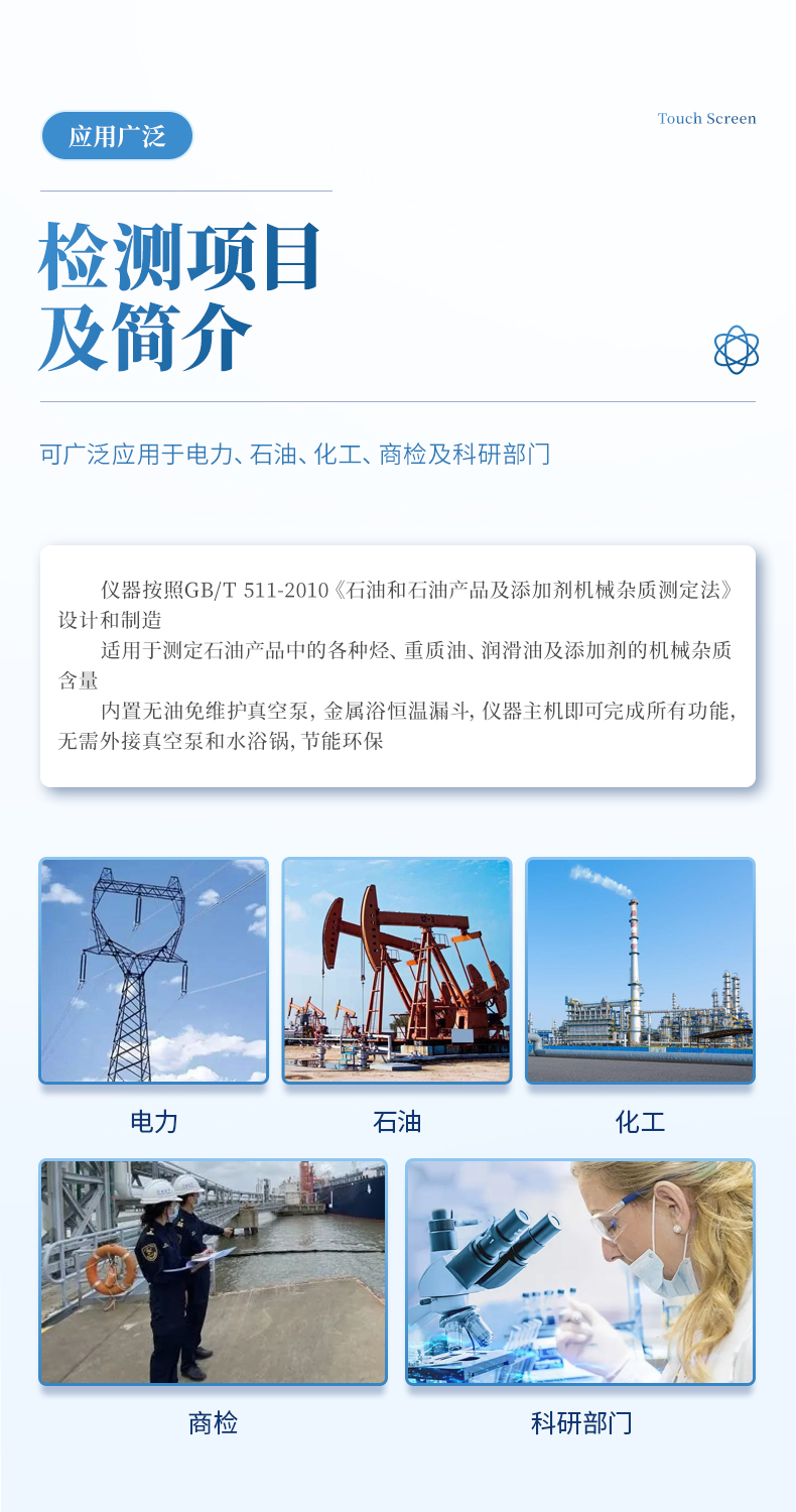 自動(dòng)機(jī)械雜質(zhì)測(cè)定儀是按照GB/T 511-2010《石油和石油產(chǎn)品及添加劑機(jī)械雜質(zhì)測(cè)定法》設(shè)計(jì)和制造的。適用于測(cè)定石油產(chǎn)品中的各種烴、重質(zhì)油、潤(rùn)滑油及添加劑的機(jī)械雜質(zhì)含量??蓮V泛應(yīng)用于電力、石油、化工、商檢及科研部門。內(nèi)置無油免維護(hù)真空泵,金屬浴恒溫漏斗,儀器主機(jī)即可完成所有功能,無需外接真空泵和水浴鍋,節(jié)能環(huán)保。