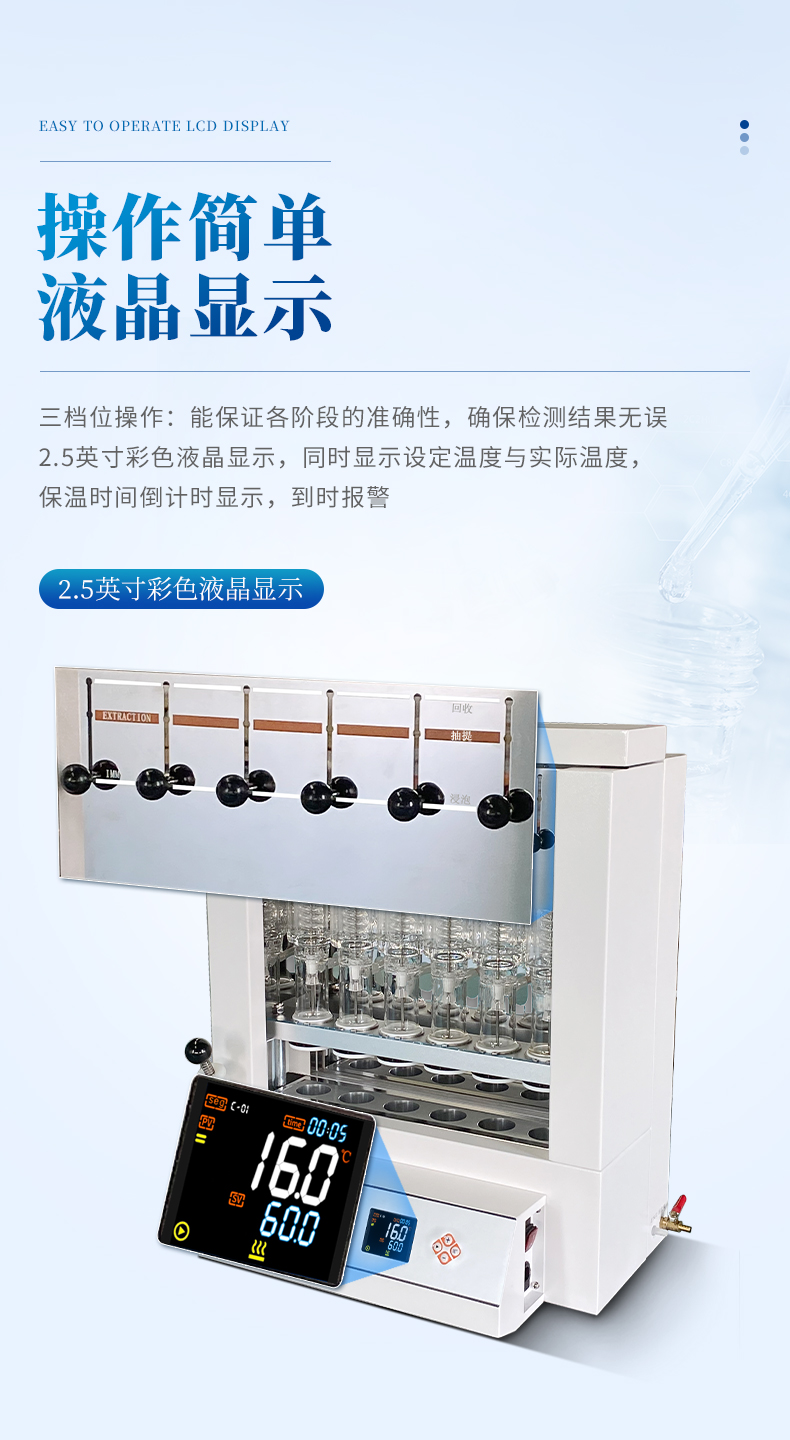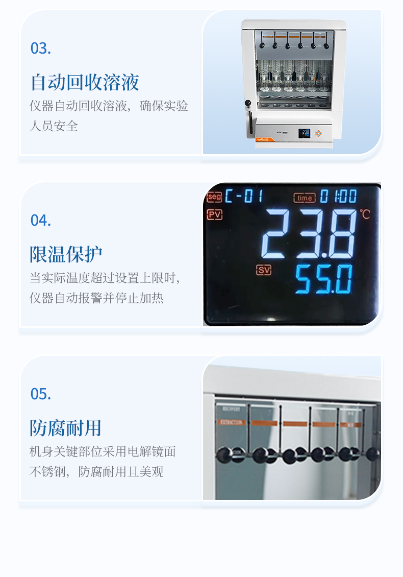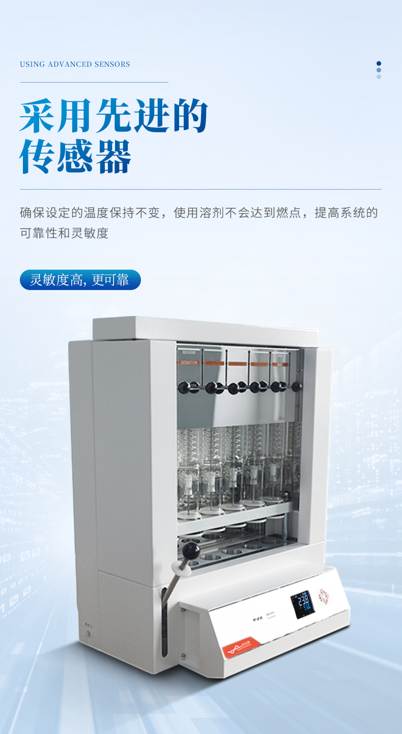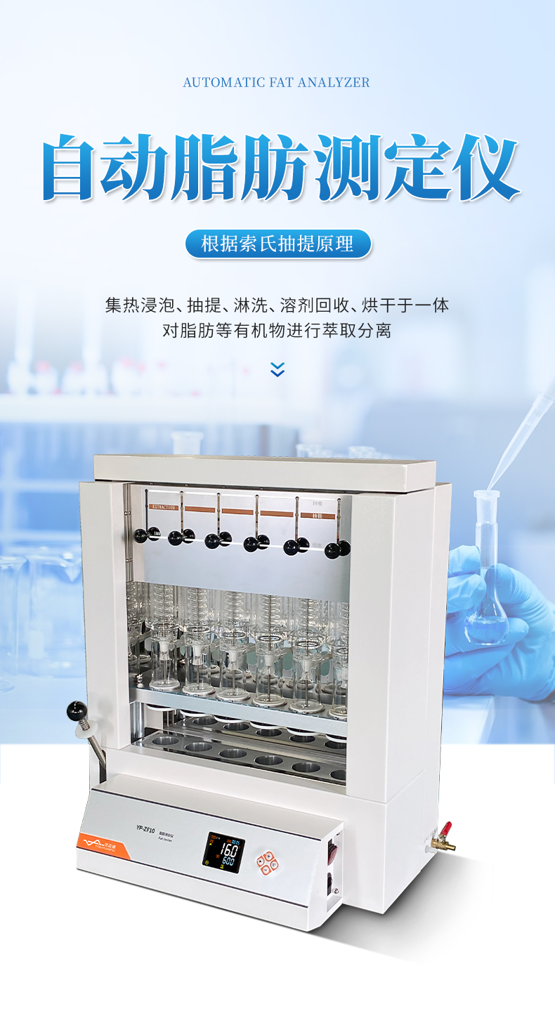 自動脂肪測定儀(索氏提取儀)是根據(jù)索氏抽提原理,集熱浸泡、抽提、 淋洗、溶劑回收、烘干于一體,對脂肪等有機物進行萃取分離的儀器。儀器采用了自  動控溫、全封閉井式電加熱形式,使儀器加溫更為均勻,安全可靠,并具有良好的密  封設施,從而達到快速準確的目的;最大限度降低溶劑用量,自動回收溶劑,節(jié)省分  析成本。具有設計合理、操作簡單、精確度高、性能穩(wěn)定、重現(xiàn)性 好、省力、省時等優(yōu)點。